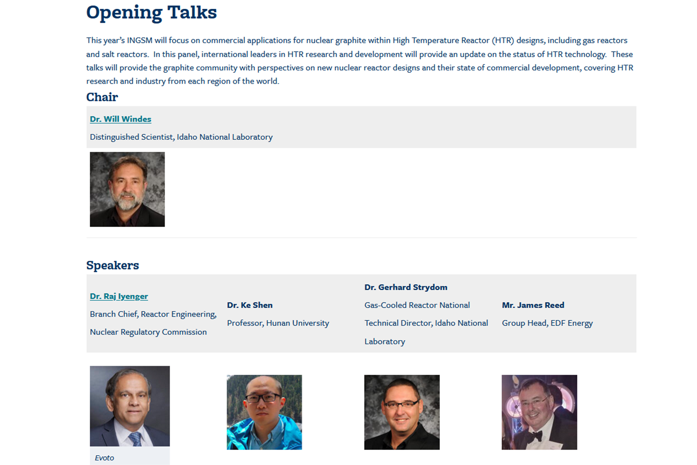 近日,2024年度国际核石墨专家会(International Nuclear Graphite Specialists Meeting, INGSM)在美国加州大学伯克利分校举行。申克教授应邀在线上作题为"HTR and Nuclear Graphite Development in China"的大会特邀报告,介绍中国高温气冷堆用核级石墨的研究、发展情况。国际核石墨专家会由国际原子能机构主办,是核级石墨领域最高水平国际会议。大会特邀报告环节由美国爱达荷国家实验室核石墨项目负责人William Windes博士主持,中国湖南大学申克教授,法国电力集团石墨组长James Reed,美国爱达荷国家实验室气冷堆国家技术总监Gerhard Strydom博士,美国核管会反应堆工程部门主任Raj Iyenger博士先后概述了中、英、美核石墨的发展和展望及美国核管会的国内监管情况。
